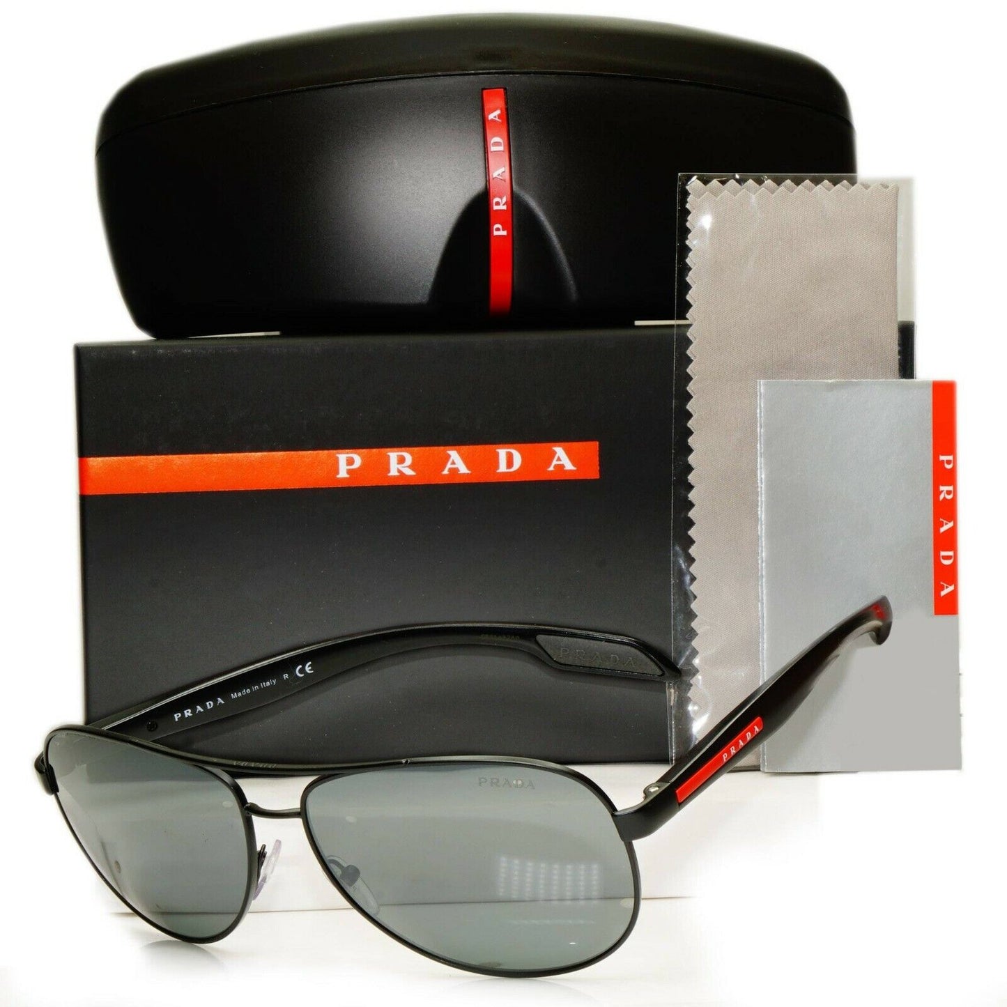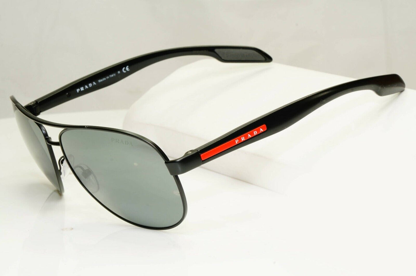 Prada Black Grey Mirror Pilot Sunglasses Mens SPS 53P 1BO-7W1 Red Stripe Sport