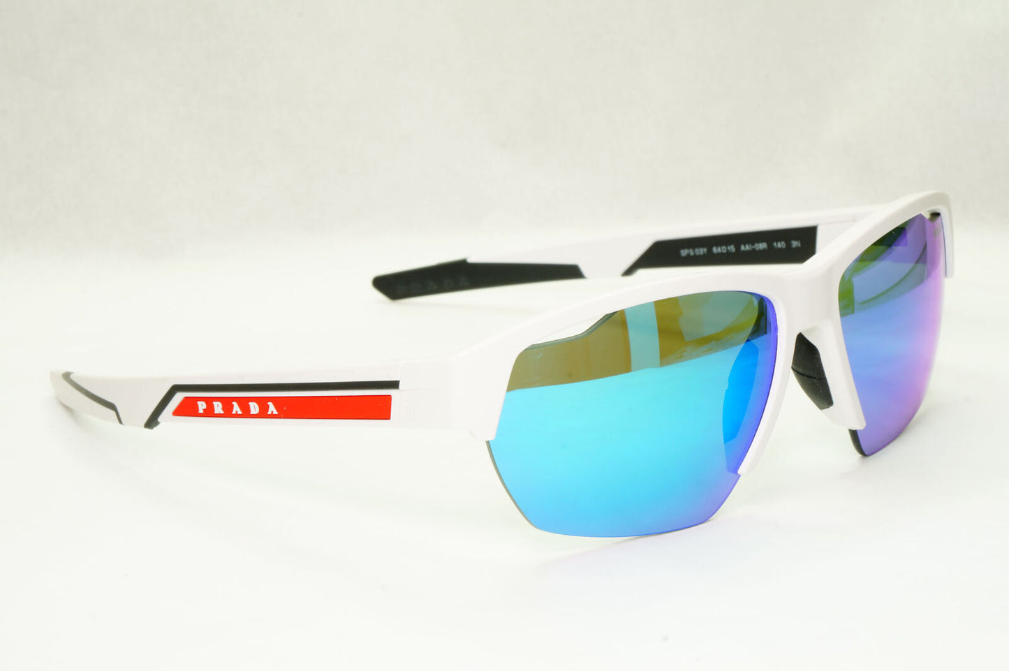 Prada Sunglasses White Blue Mirror Wrap Sport Red Stripe PS03YS SPS 03Y AAI-08R